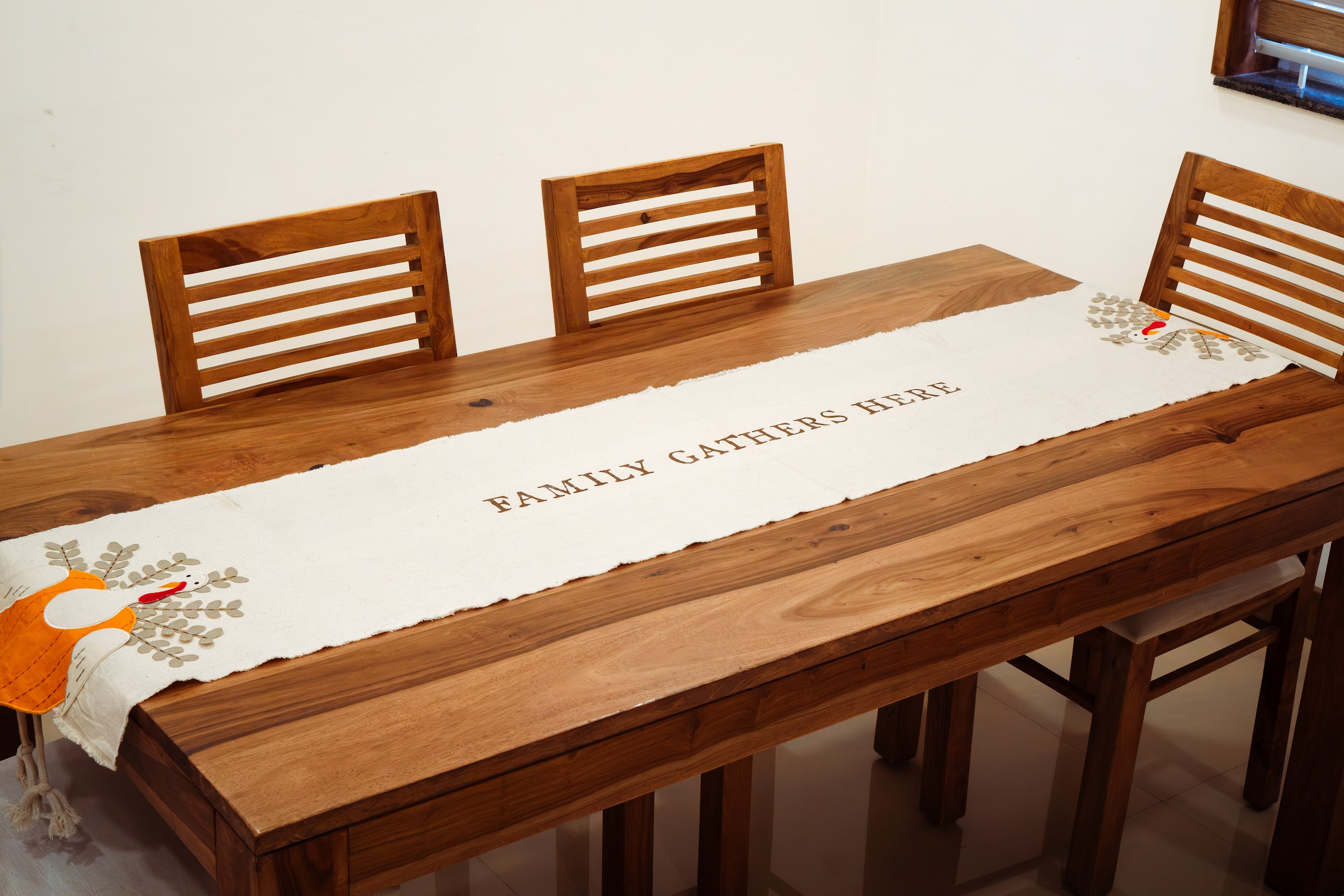 A warm, festive table runner for 6-seater tables featuring a charming turkey motif on both ends and the phrase “Family Gathers Here” at the center. Perfect for creating a cozy, welcoming dining setting.