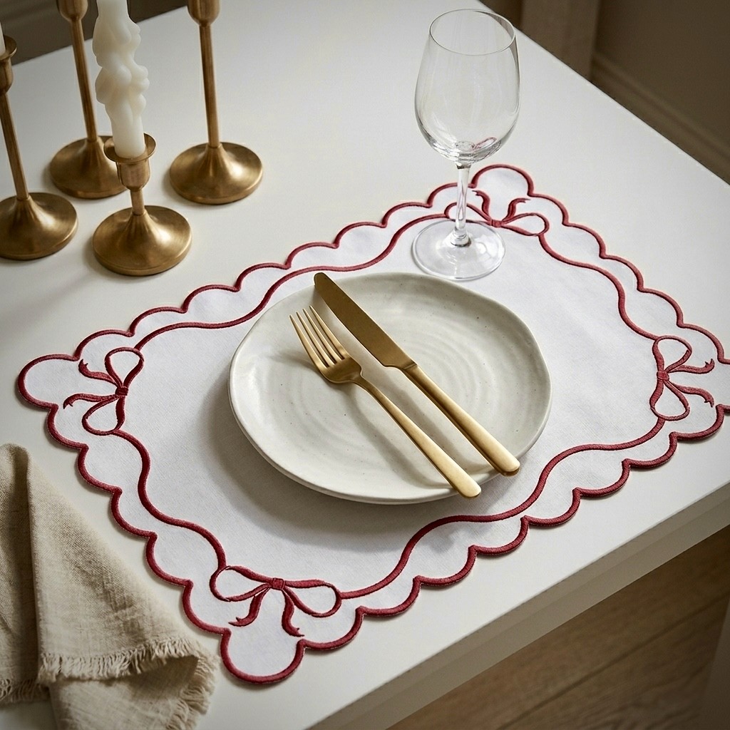 Woven 100% cotton mats with scalloped edges and red ribbon embroidery—simple, elegant, and perfect for any table setting.