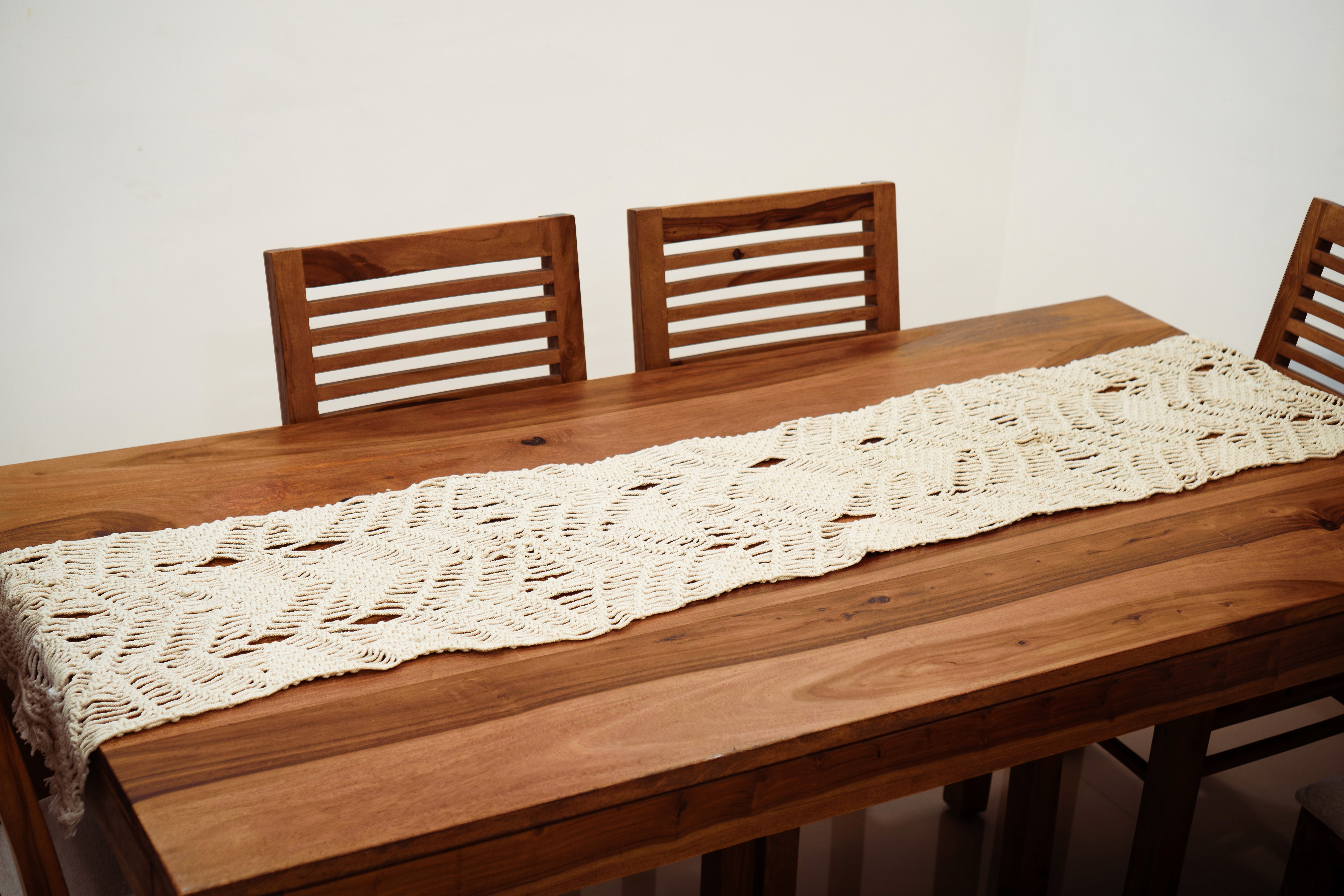 A beautifully crafted table runner for 6-seater tables, featuring an intricate handwoven macramé pattern in a natural tone. Perfect for adding a rustic, boho-inspired elegance to your dining space.