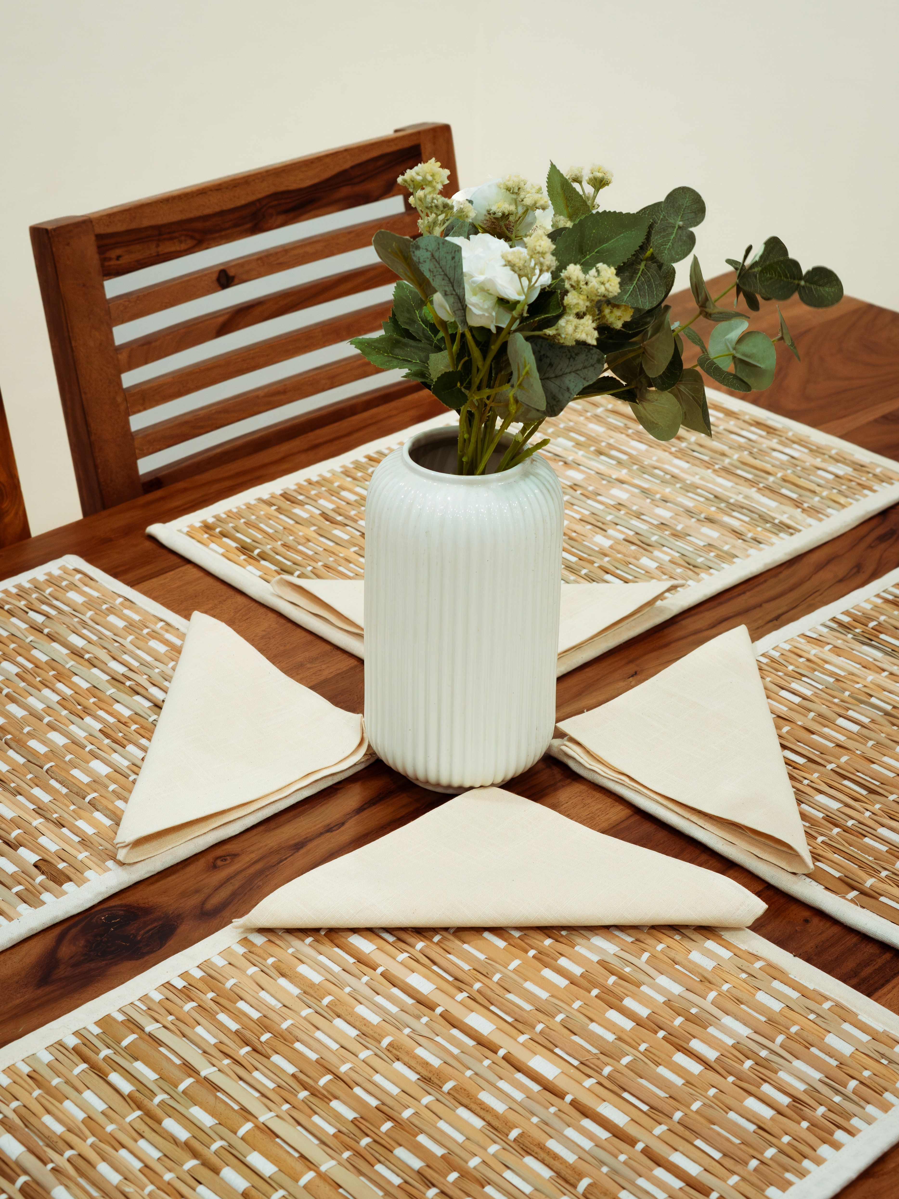 A stylish 6-seater table set featuring woven placemats with a natural finish and matching neutral napkins. Perfect for adding a clean, modern touch to everyday dining.