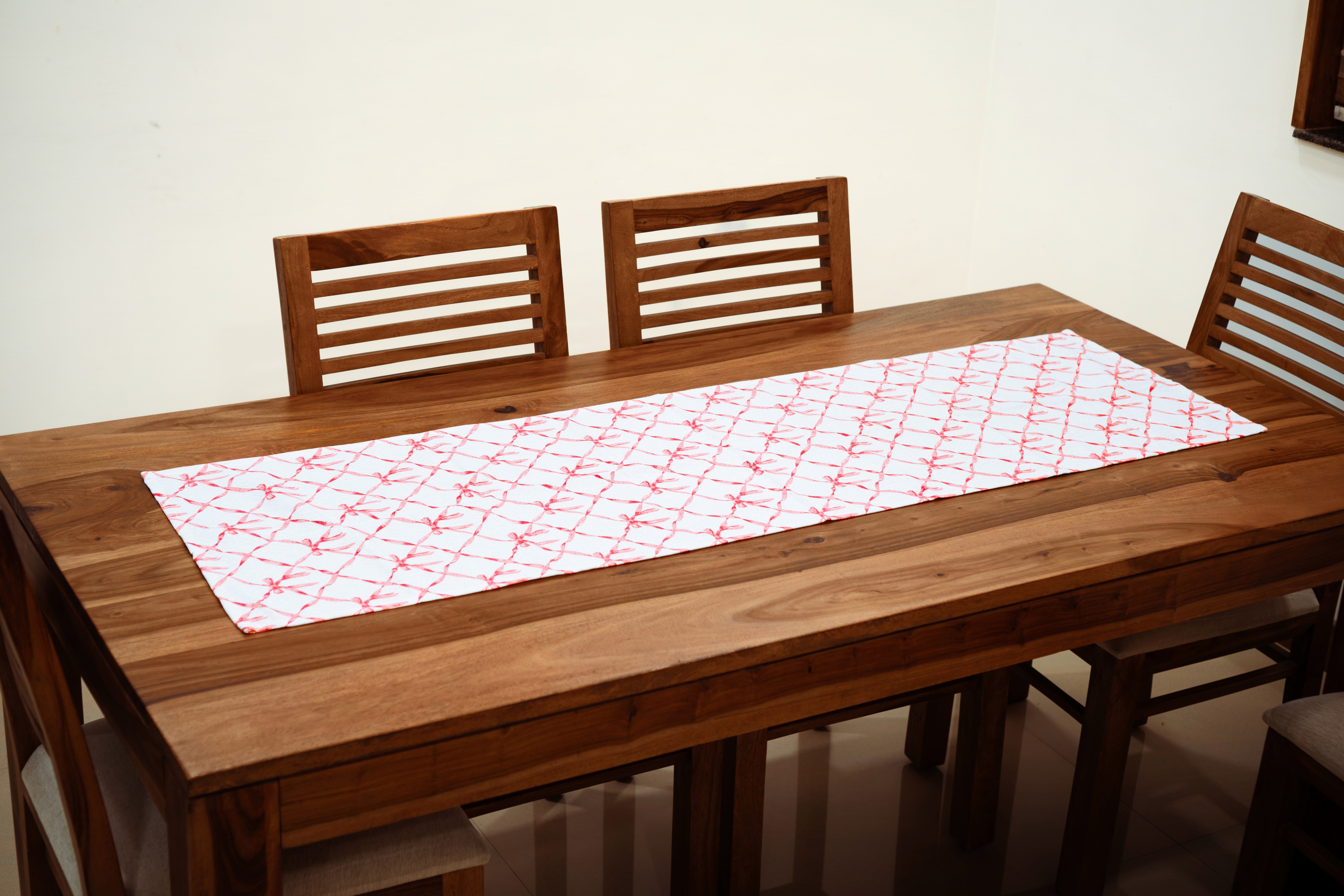 A stylish table runner designed for 6-seater tables, featuring a clean white base with delicate red heart prints and a bold red border. Perfect for adding a subtle, elegant touch to everyday dining or special occasions.