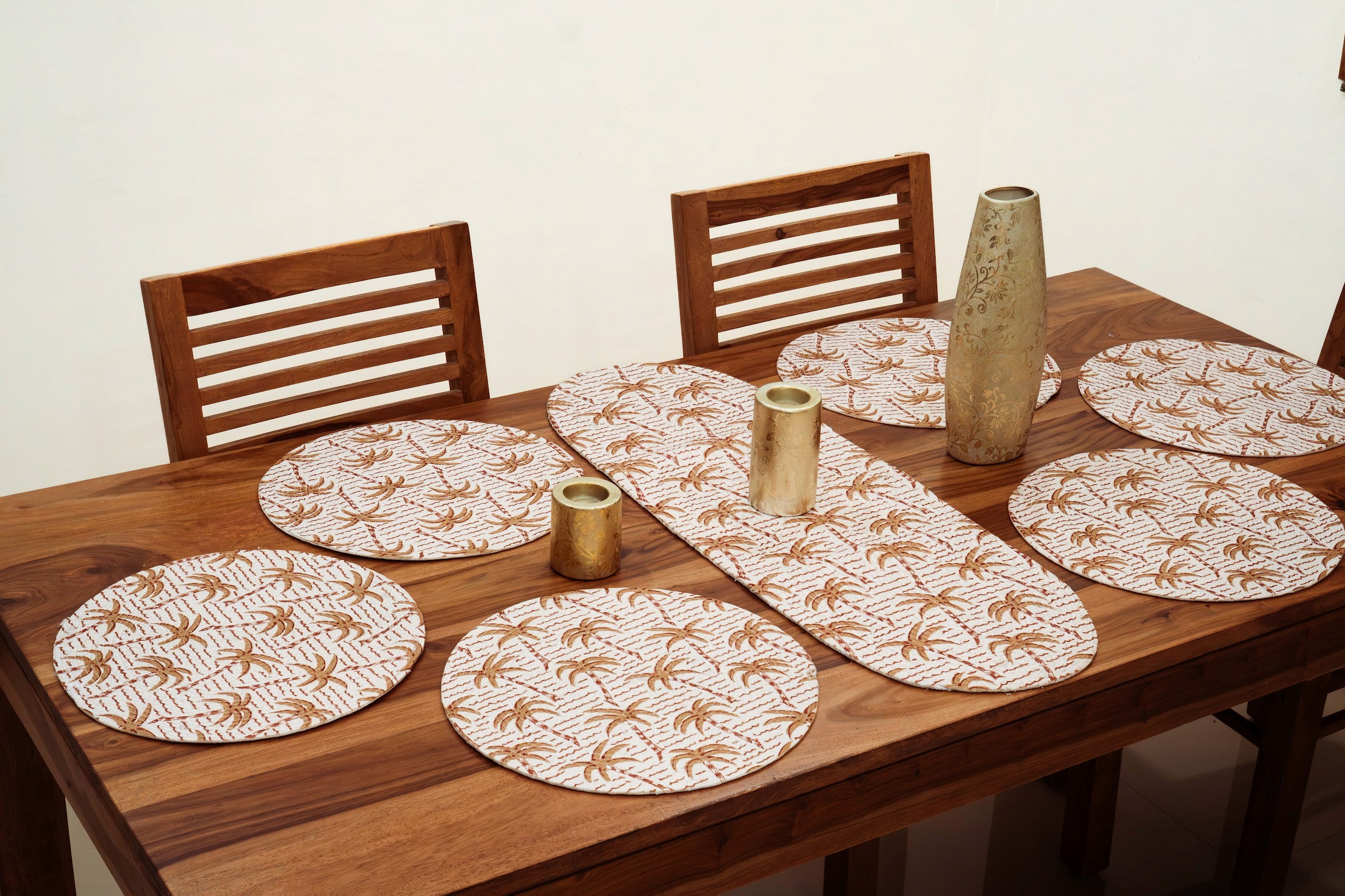 An elegant round cotton placemat featuring intricate palm motifs in warm neutral tones, designed to add a subtle, sophisticated charm to your dining setting.
